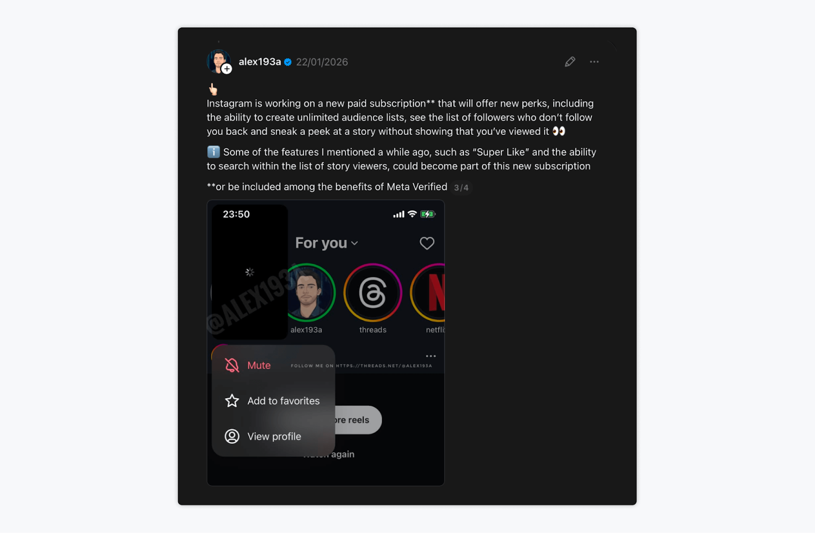 Previously spotted features such as Super Likes and searching within Story viewer lists may also be included, either as part of this subscription or bundled into Meta Verified.