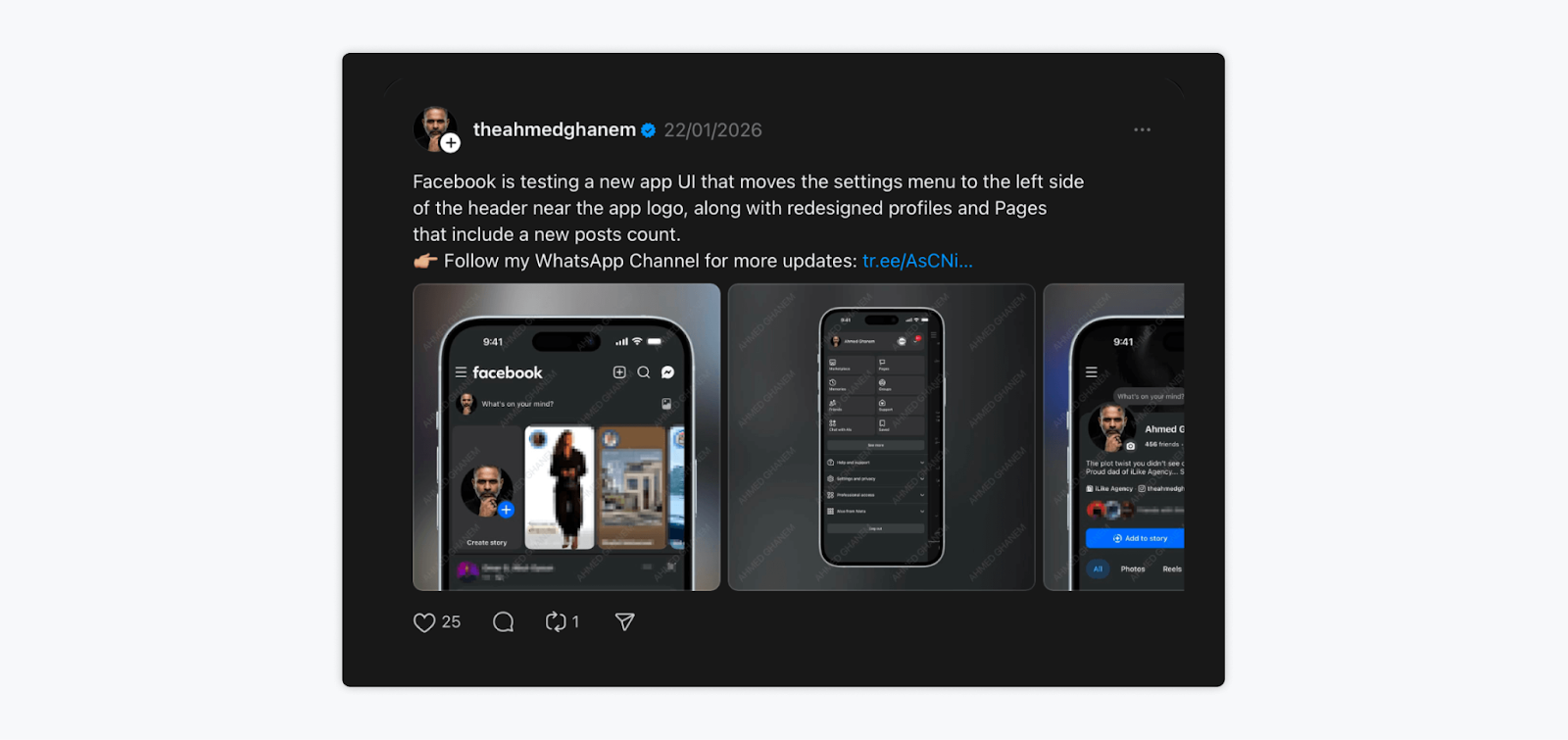 Facebook is experimenting with a refreshed app interface that moves the settings menu to the left side of the header near the app logo. The test also includes redesigned profiles and Pages featuring a new post count display.